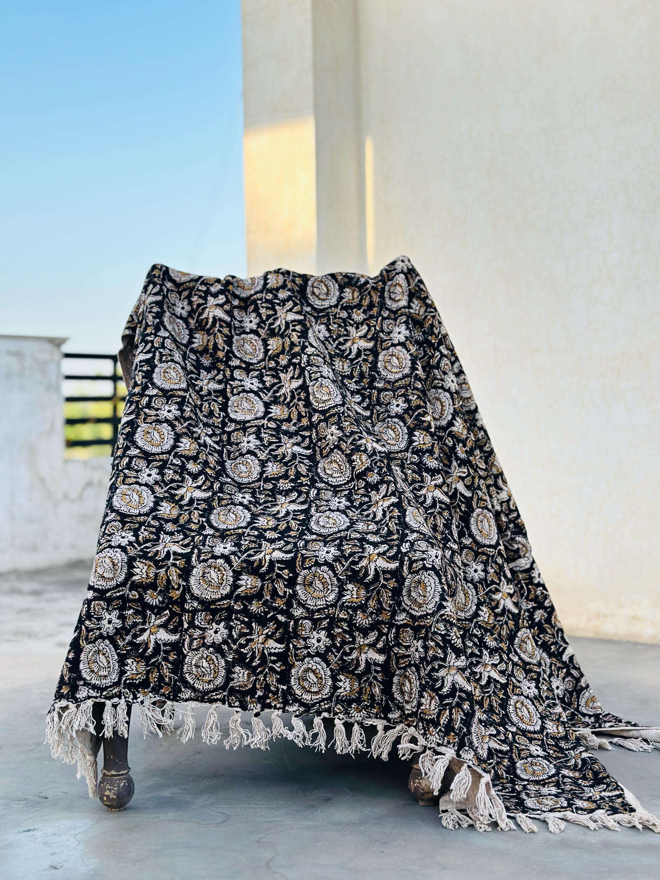 Elevate your home décor with our 100% Organic Cotton Throw Blanket. This thick, hand-block printed throw is designed to add a chic, vintage touch while providing ultimate comfort and warmth. Whether draped over your couch, wrapped around you on a chilly evening, or used as a stylish decor accent, this throw blanket is perfect for any space.