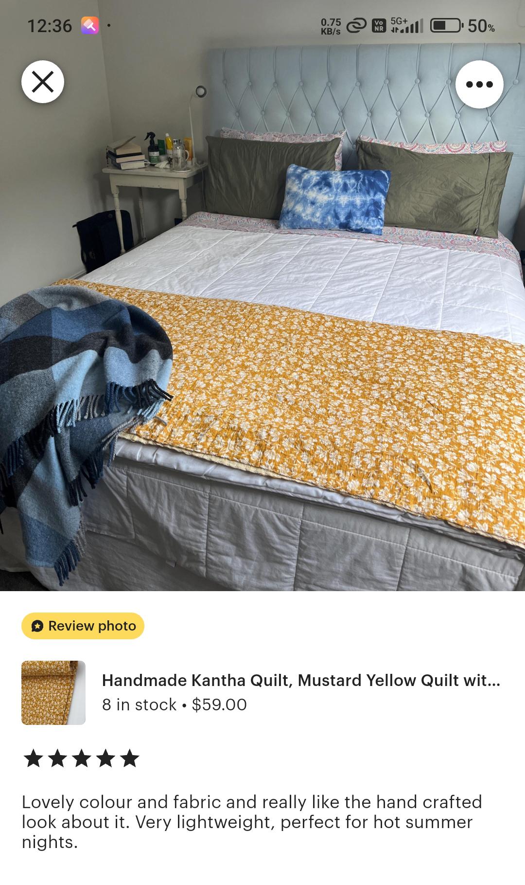 Handmade Kantha Quilt, Mustard Yellow Quilt with White Floral Print, Cotton Bedspread, Lightweight Blanket, Boho Bedding Queen Coverlet
