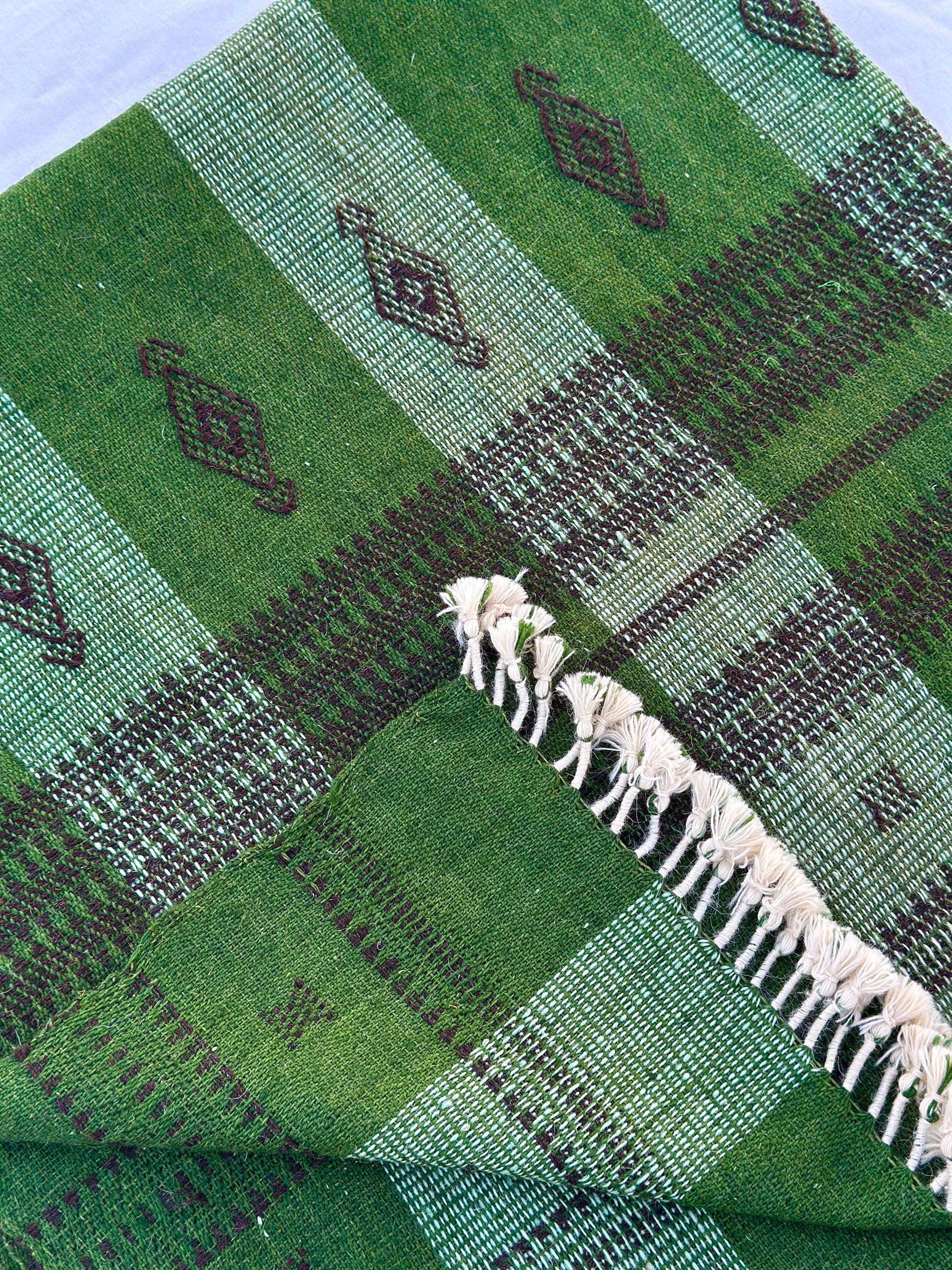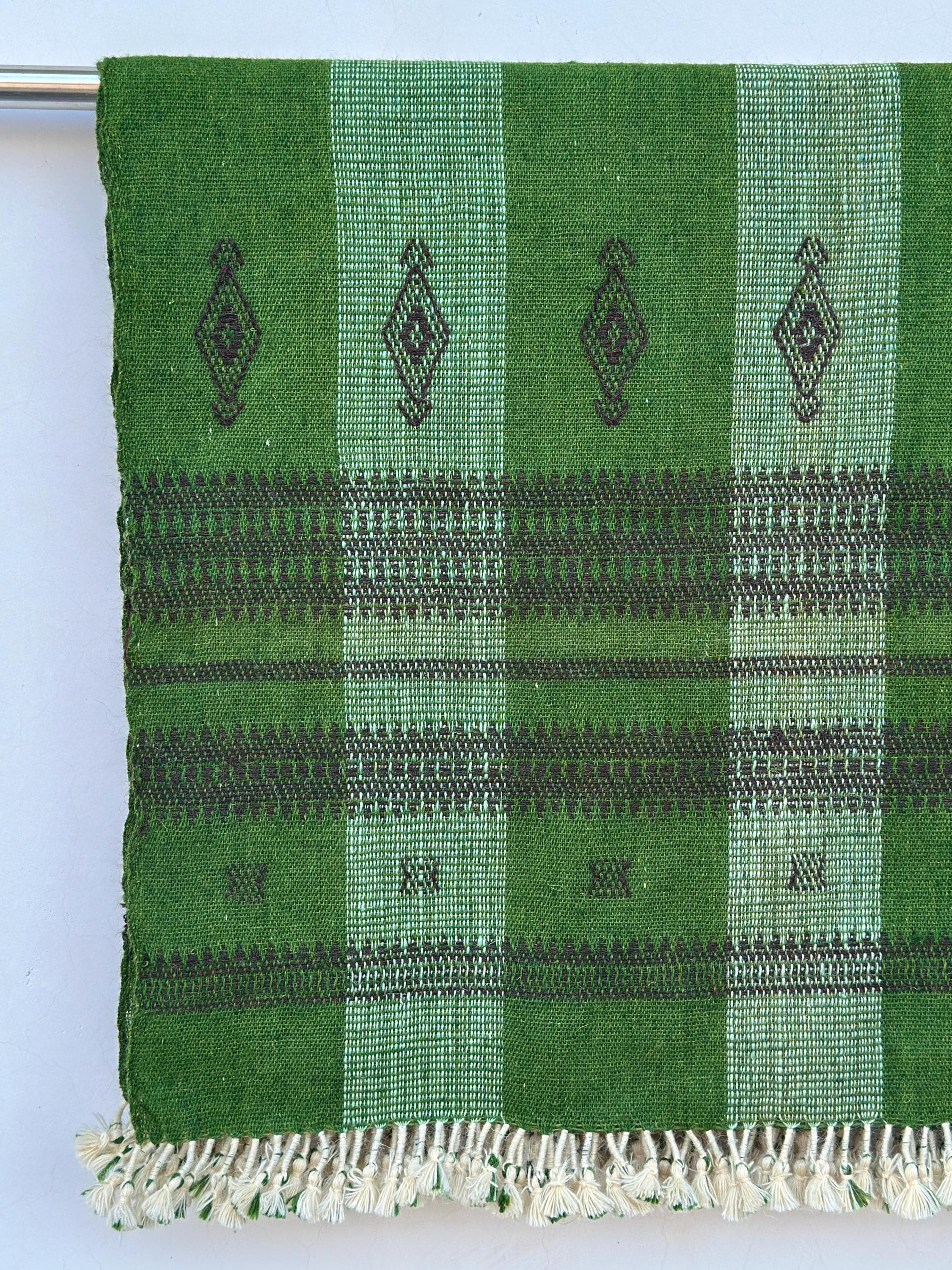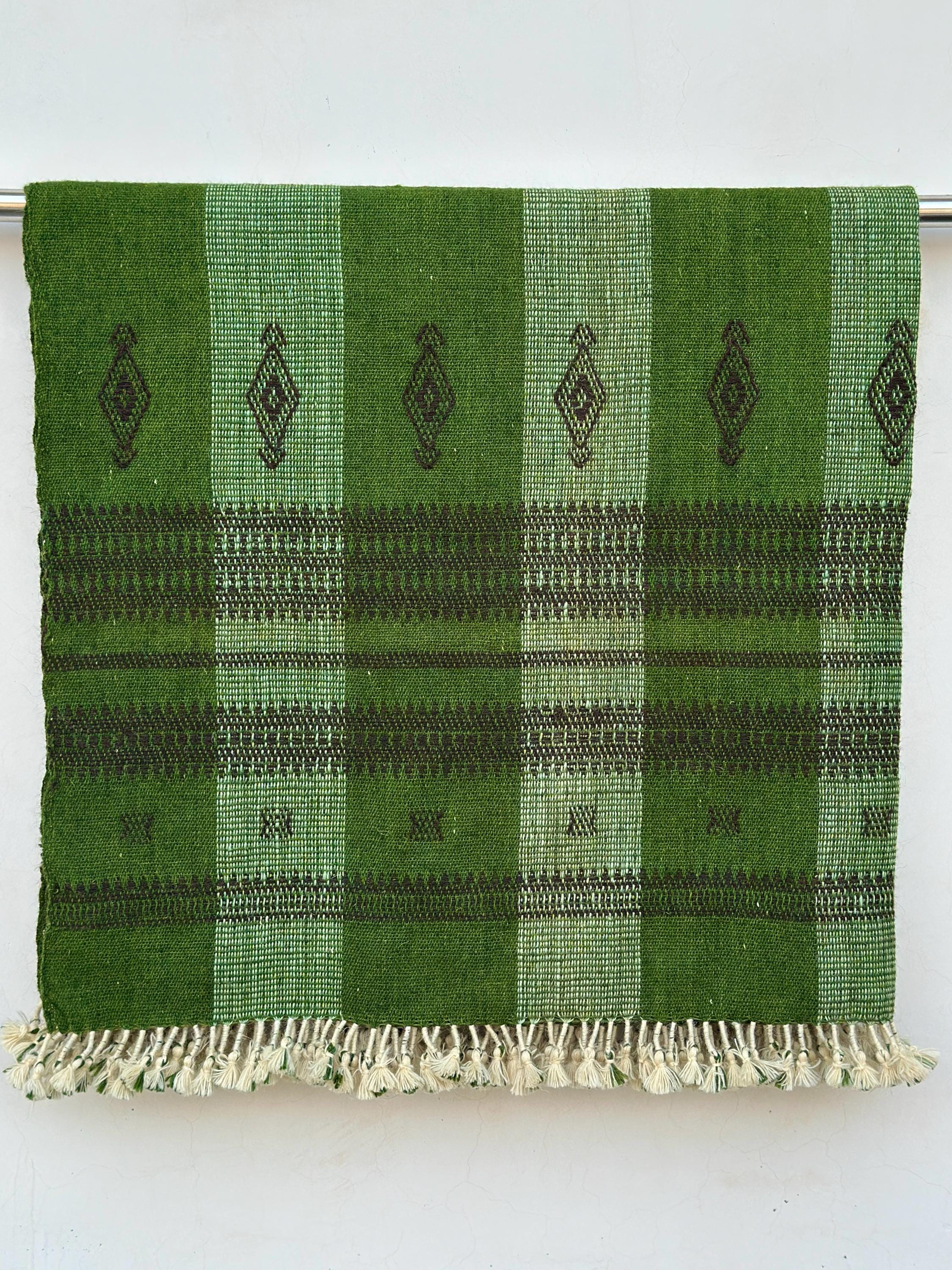 Bring warmth, texture, and heritage into your home with our handcrafted Bhujodi wool throw. Made from 100% naturally dyed wool, this beautiful piece features a teal green base with off-white stripes, geometric patterns, and charming pompoms at the edges. Each throw is a unique work of art, woven by hand in a 500-year-old tradition from Gujarat, India.