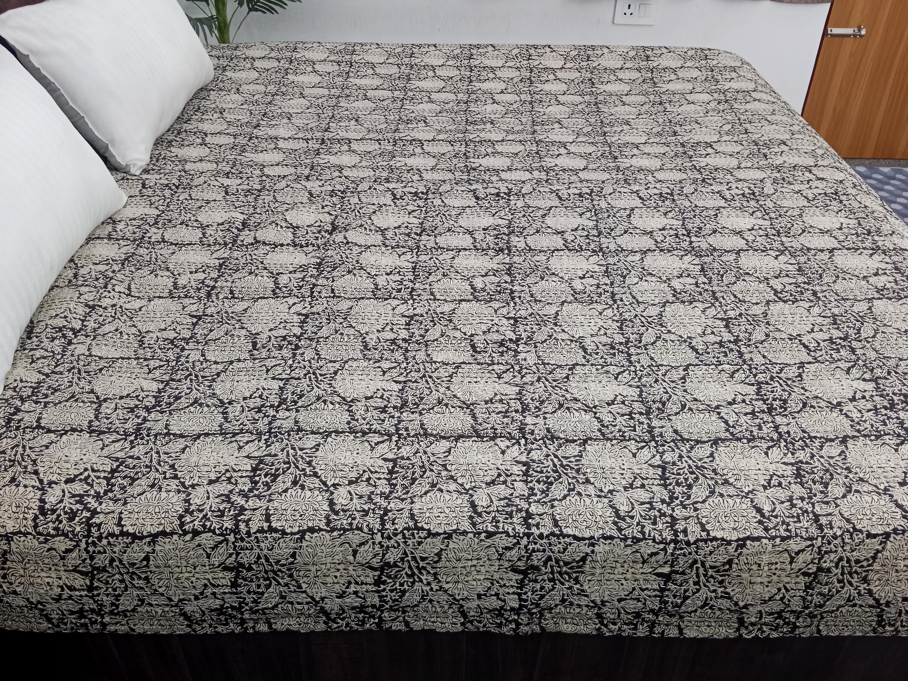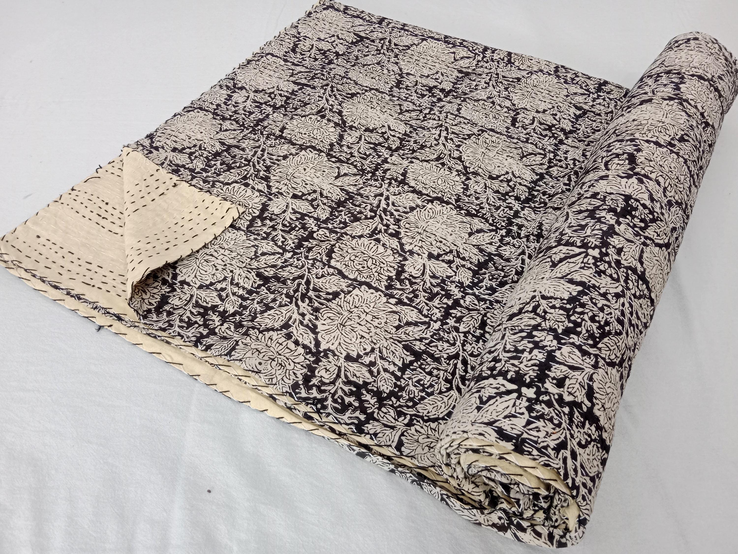Black Floral Kantha Quilt, Vintage Handmade Bedspread, Boho Throw Blanket