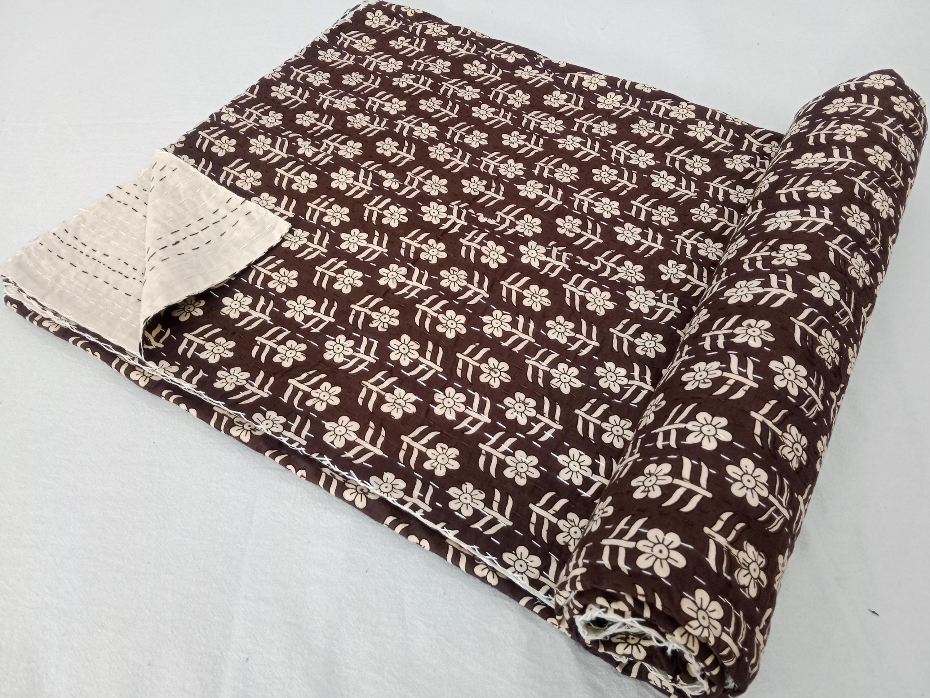 HandBlock Print Kantha Quilt Bedding Floral Handcrafted Cotton Bedspread Handmade Cotton Kantha Quilt Full Size Bedding Bedspread